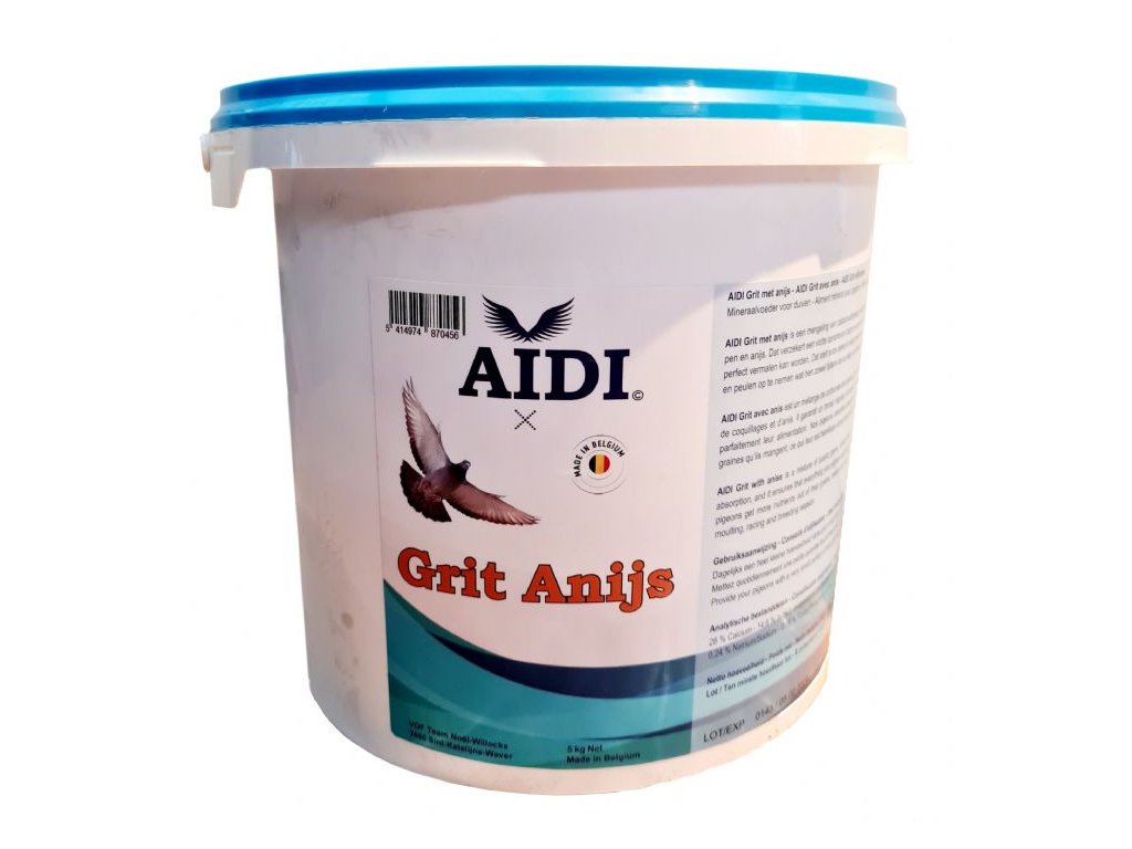 AIDI Grit s anýzem je směsí křemenného štěrku, ústřicových lastur a anýzu. To podporuje snadné vstřebávání a zajišťuje, že vše, co vaši holubi snědí, bude správně rozemleto.