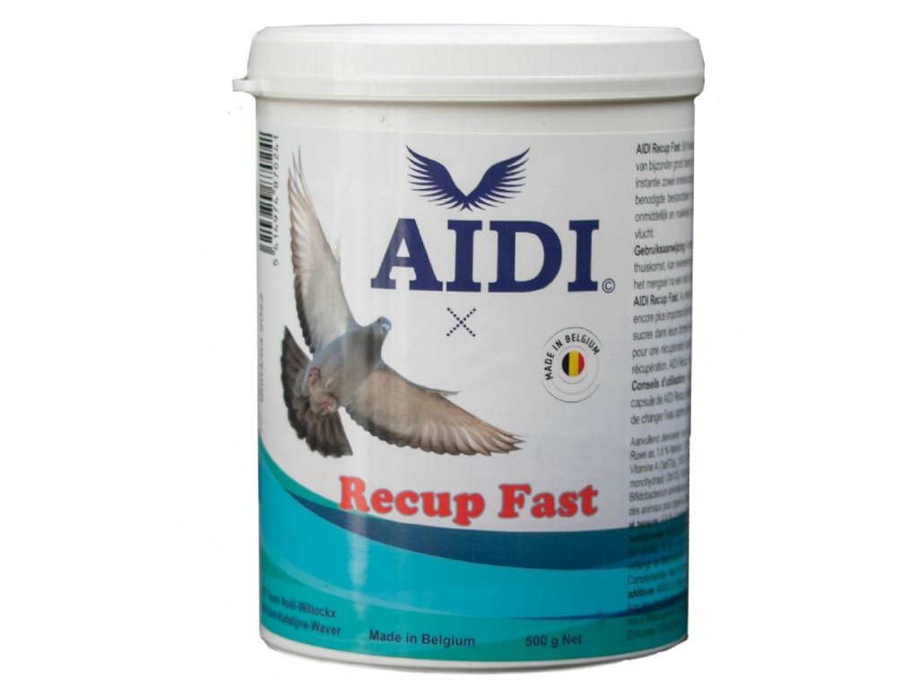 Stejně důležité je holubům poskytnout všechny stavební bloky potřebné pro rychlou regeneraci po závodě. Ta se skládá především z jednoduchých a komplexních cukrů nebo sacharidů, vysoce stravitelných mastných kyselin a stavebních bloků bílkovin. AIDI Recup Fast poskytuje potřebné složky ve správném poměru pro podporu rychlejší regenerace a zotavení. AIDI Recup Fast je ve vodě rozpustná směs rychle a snadno stravitelných zdrojů energie a regenerace a dalších stavebních bloků. AIDI Recup Fast je váš produkt dle volby pro rychlejší regeneraci a zotavení po závodě. Pokyny pro uživatele: Ihned po příjezdu podávejte 1 g AIDI Recup Fast na holuba denně nebo 4 odměrky (20 g) na litr pitné vody.